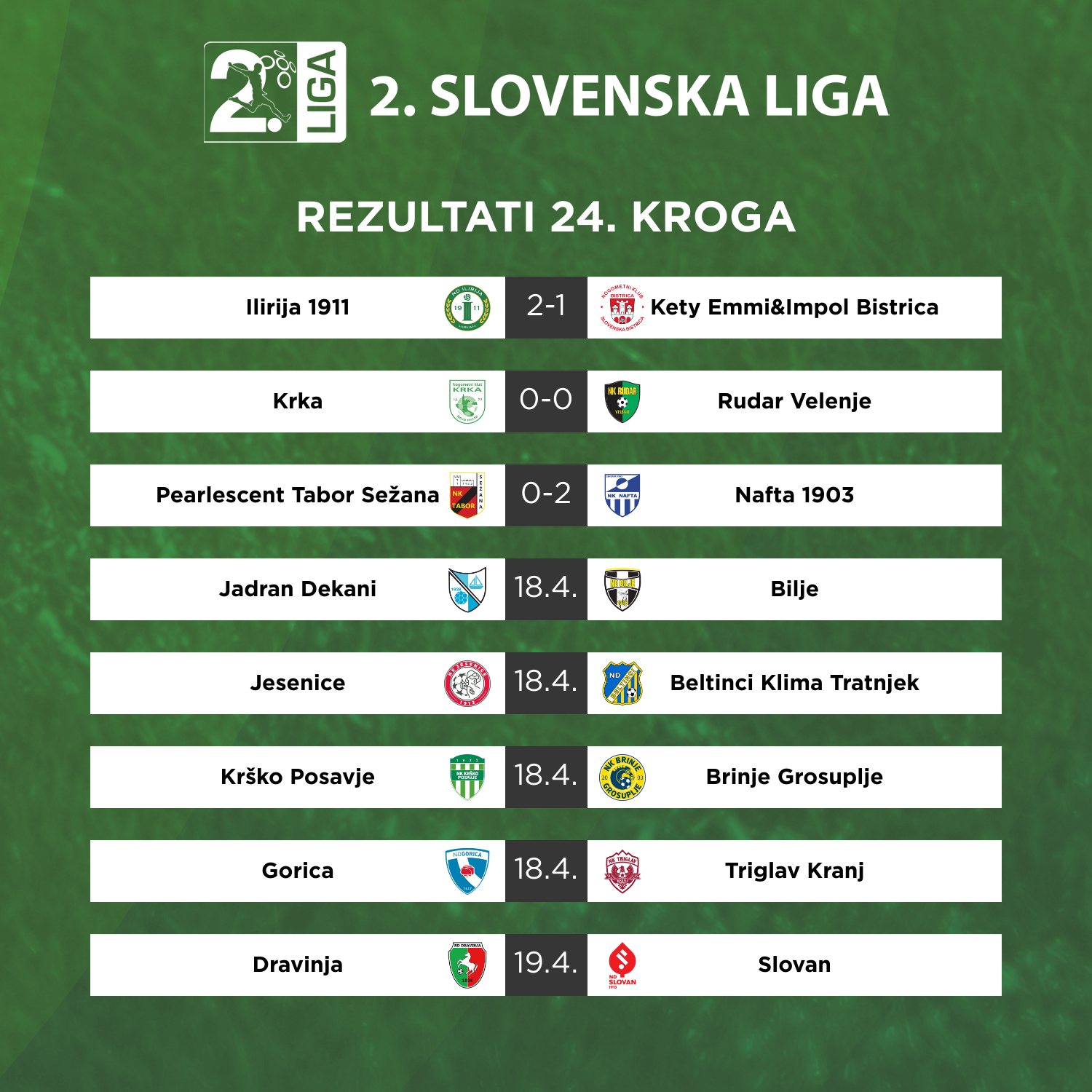 S tremi petkovimi tekmami se je začel 24. krog 2. SNL. Ilirija 1911 je bila s preobratom na domačem igrišču boljša od Bistrice, dvoboj Krke in Rudarja ni dal zmagovalca, v Sežani pa so se zmage razveselili Lendavčani.