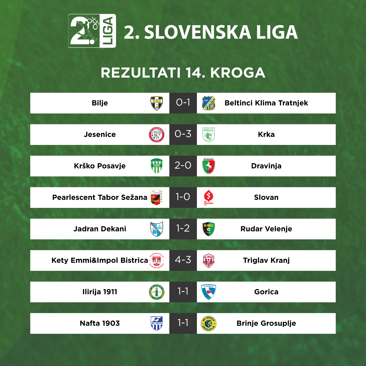 Jeseničani so pred dobrim tednom v Velenju prekinili serijo porazov, v 14. krogu pa so doživeli nov poraz. Zmage pod Karavankami so se razveselili Novomeščani, ki so s tremi zadetki zacelili rane po pokalnem porazu v Račah. Domača mreža se je prvič tresla v 29. minuti tekme, ko je Domen Žur postavil izid polčasa. Gostje so odločno zakorakali v nadaljevanje srečanje, le nekaj sekund po vrnitvi na igrišče je prednost Krke podvojil Tai Meze. Piko na i zmagi Dolenjcev je v 58. minuti postavil Gregor Medle. Krka je s tretjo zmago sezone prišla do 14. točke, Jeseničani ostajajo pri šestih.
