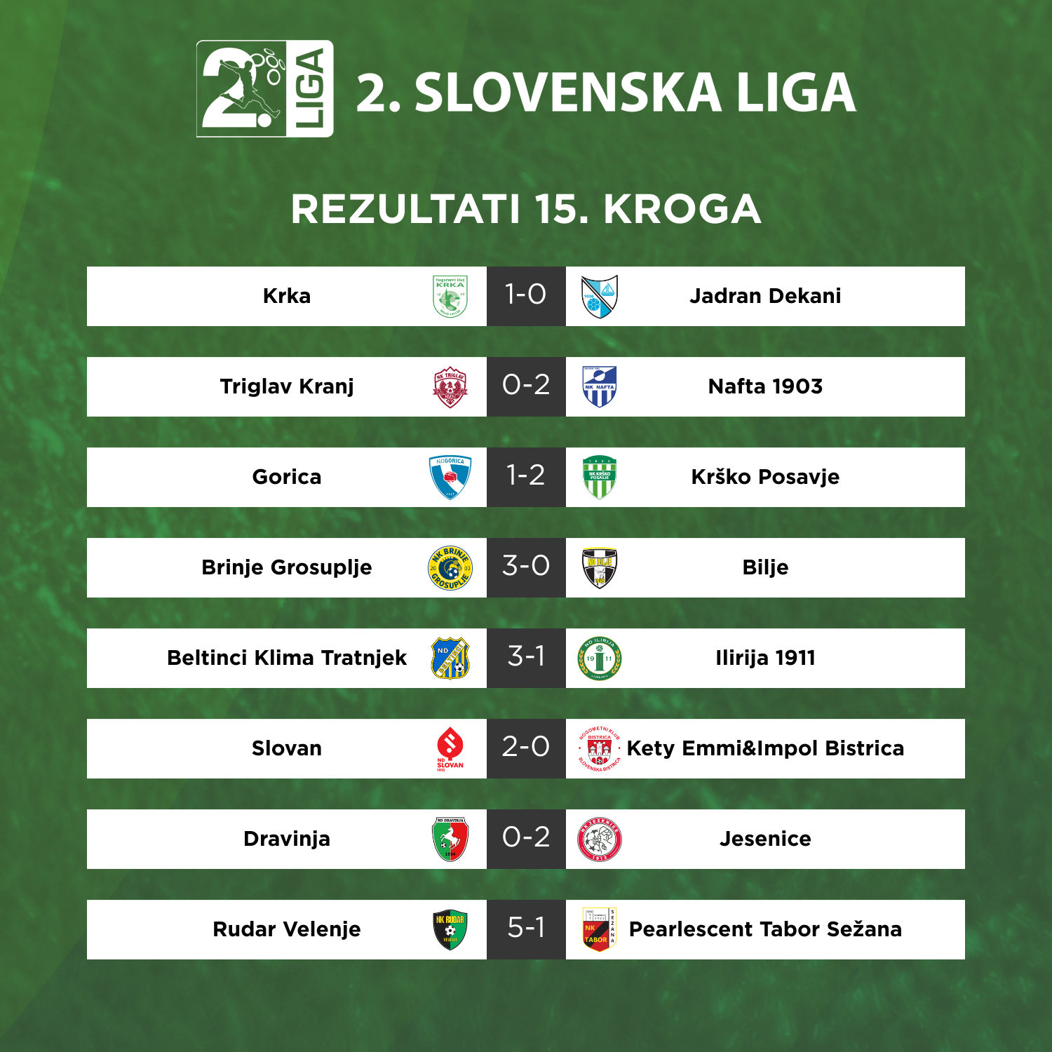 Gorica po polovici 2. SNL še vedno čaka na prvo zmago, modro-beli so zmagovalni post podaljšali tudi v 15. krogu prvenstva, v katerem so izgubili s Krčani. Štirikratni državni prvaki so sicer dobili prvi polčas, tik pred odmorom je za vodstvo gostiteljev zadel Kevin D'Almeida Kouevi, a so Krčani v nadaljevanju tekme prišli do popolnega preobrata. Po dobri uri igre je izenačil Fran Penezić, v zadnji minuti rednega dela srečanja pa je Posavce z golom za tesno zmago razveselil Prosper Obiora Nwachukwu. Krčani pod taktirko Adnana Zildžovića pridno nabirajo točke, na zadnjih štirih tekmah so vknjižili kar tri zmage, s tokratnim uspehom pa so Gorici pobegnili na deset točk prednosti.