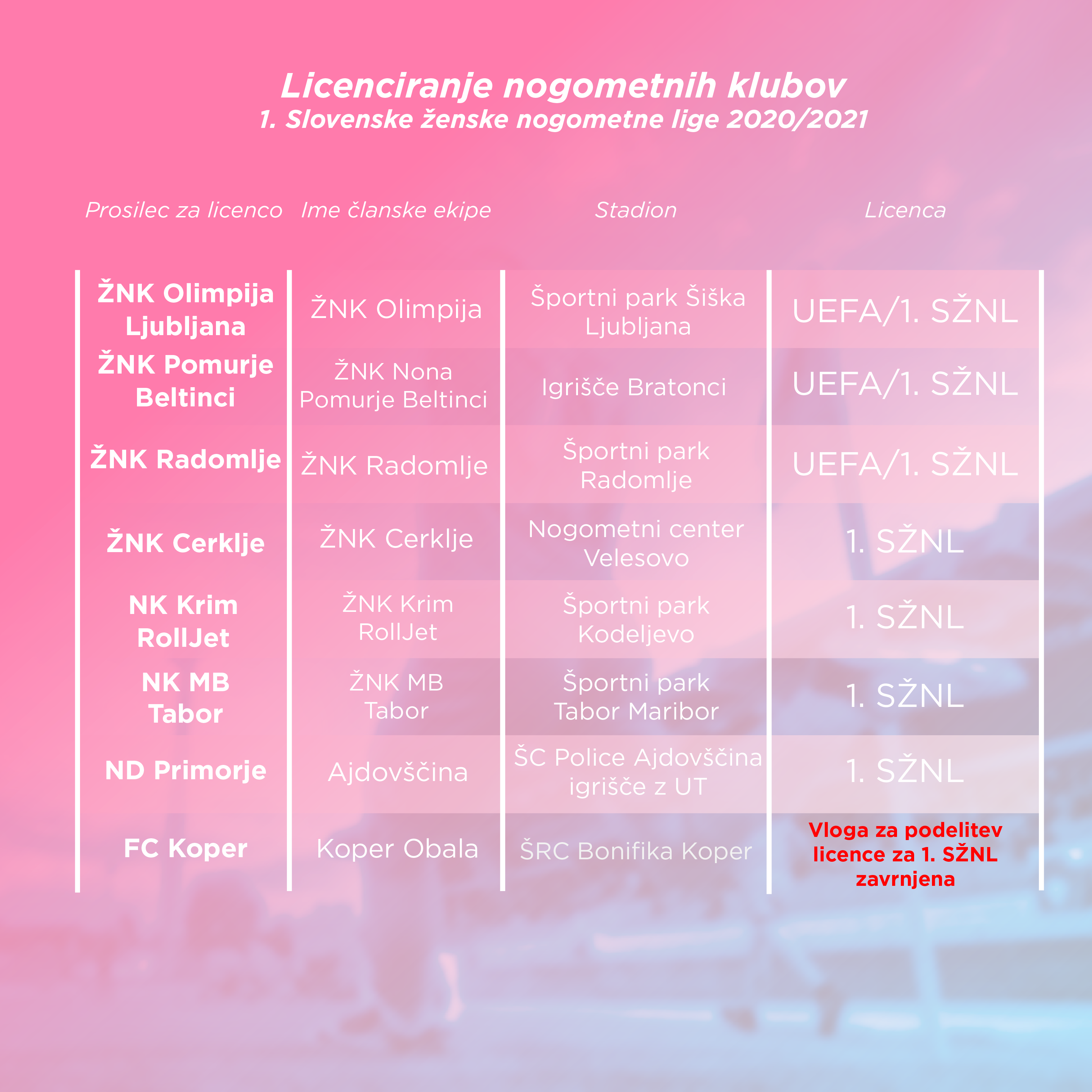 Komisija Nogometne zveze Slovenije za licenciranje nogometnih klubov je danes objavila tudi rezultate licenčnega postopka za klube 1. Slovenske ženske nogometne lige za sezono 2020/21. Sedem klubov uspešnih že na prvi stopnji, trije tudi z licenco za evropska tekmovanja.