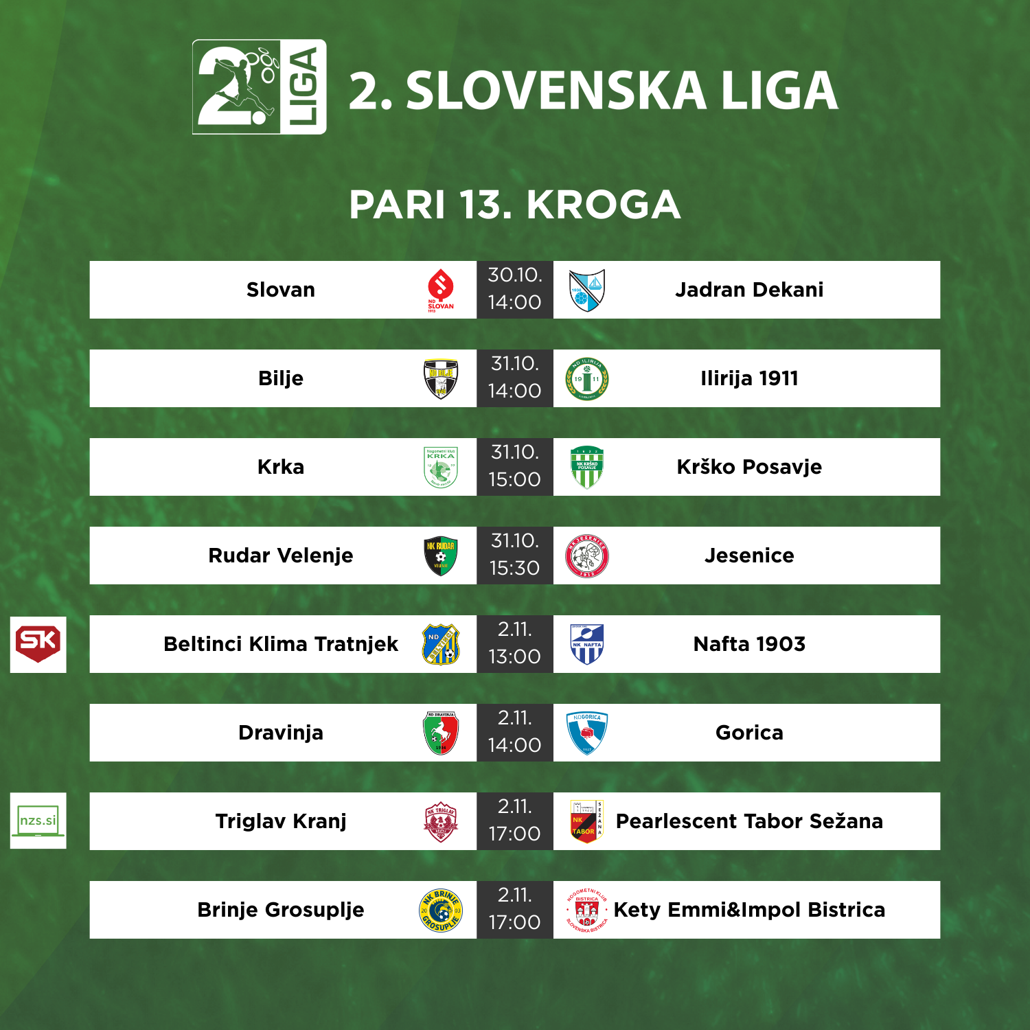 Tekmovalni spored bodo v četrtkovem popoldnevu odprli nogometaši Slovana in Jadrana Dekanov. Ljubljančani se v obračun s Primorci podajajo s pozitivno popotnico, pet tekem dolg zmagovalni post so v minulem krogu prekinili na Gorenjskem, na Jesenicah so slavili z izidom 2:3. Za zmago čete trenerja Luke Žinka so zadeli Igor Kondić, Tian Kujović in Aleks Ristić, rdeči pa bodo skušali prvič v letošnji sezoni povezati dve zmagi. Se lahko Ljubljančani veselijo tudi na domačem igrišču? Na Kodeljevo prihajajo Dekančani, ki v zadnjih tednih ne najdejo poti do zmage. Primorci so tretjo in hkrati tudi zadnjo zmago te sezone slavili v petem krogu, ko so bili na domačem igrišču boljši od Ilirije, pred dnevi pa so kljub trem doseženim zadetkom ostali praznih rok v dvoboju s Triglavom. Bo primorska obramba trdnejša v prestolnici?