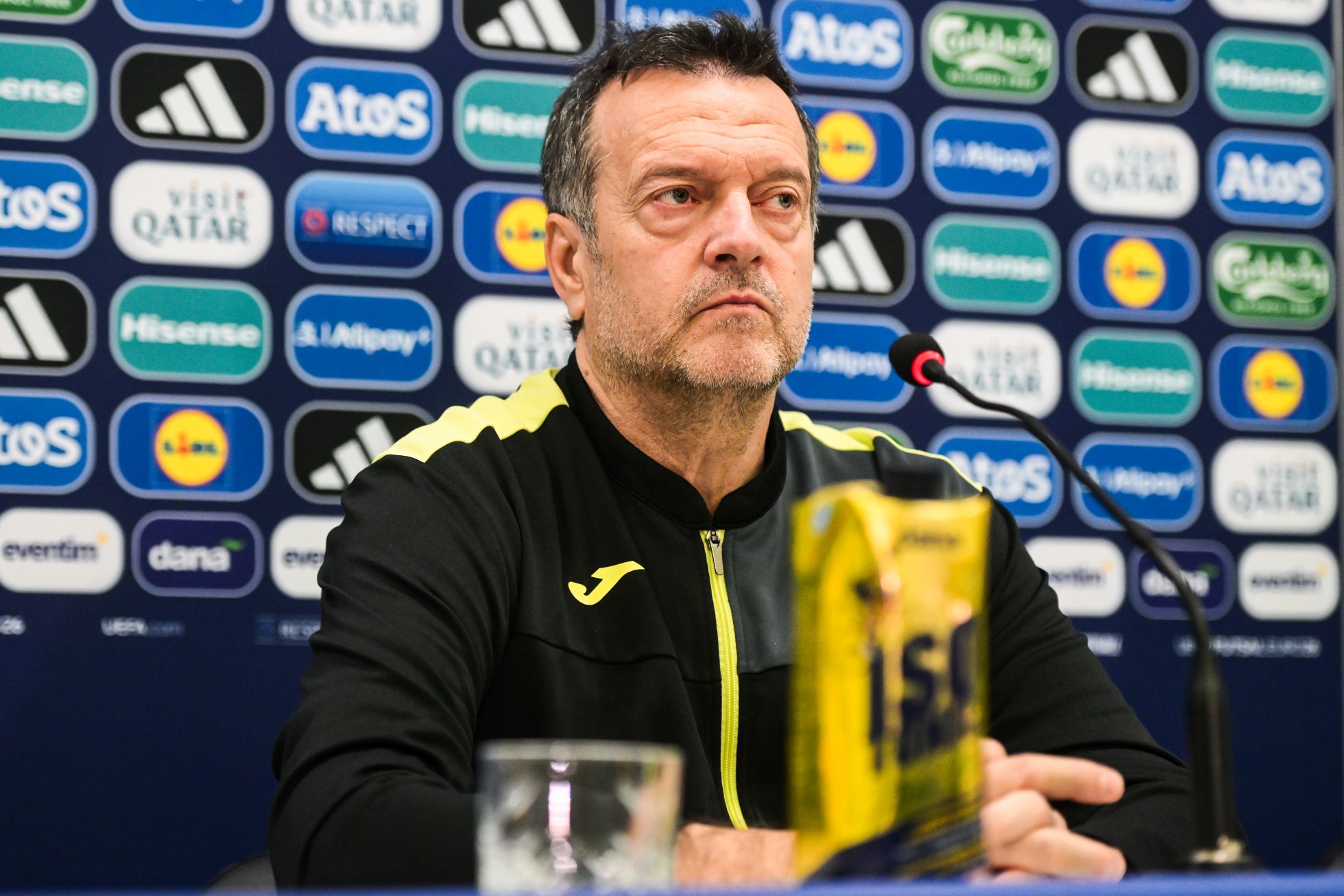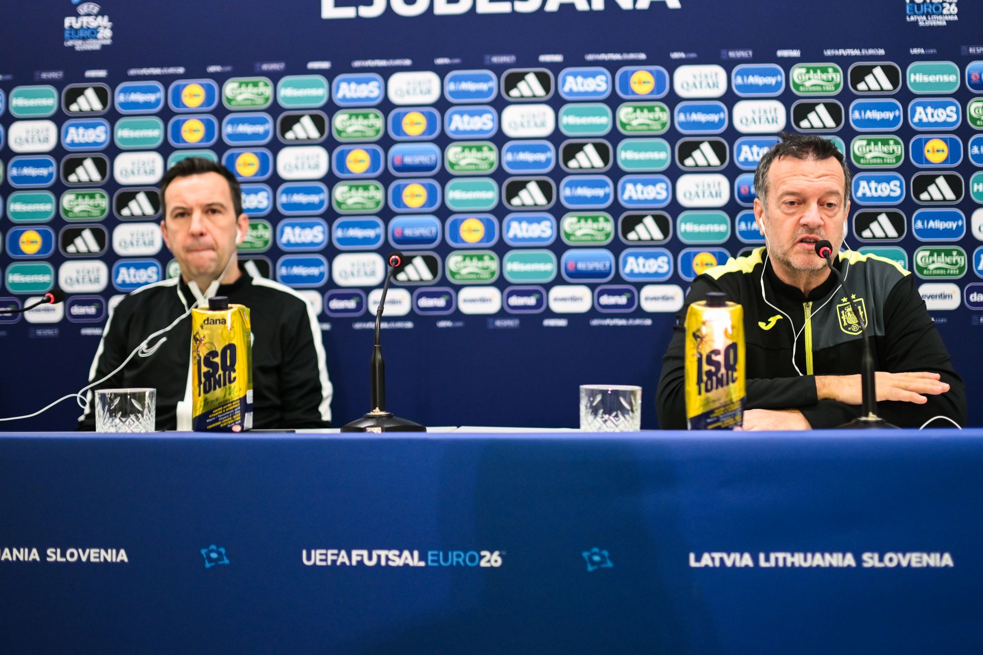 »Najprej bom izkoristil priložnost, da se zahvalim Španiji, ker je ta naš šport, futsal, dvignila na tako visok nivo. To jim je uspelo tako z njihovo ligo, ki je najboljša na svetu, kot z odnosom do tega tako lepega športa. Vse nas je prisilila, da se ji približamo. Vsi po vrsti se učimo od Španije,« je uvodoma povedal slovenski selektor Tomislav Horvat. »Sobotna tekma z Ukrajino nam je odkrila nekaj pomanjkljivosti, ki smo jih na treningih do danes odpravili in se o njih pogovorili. Prepričan sem, da smo bolje pripravljeni,« je pristavil slovenski selektor.