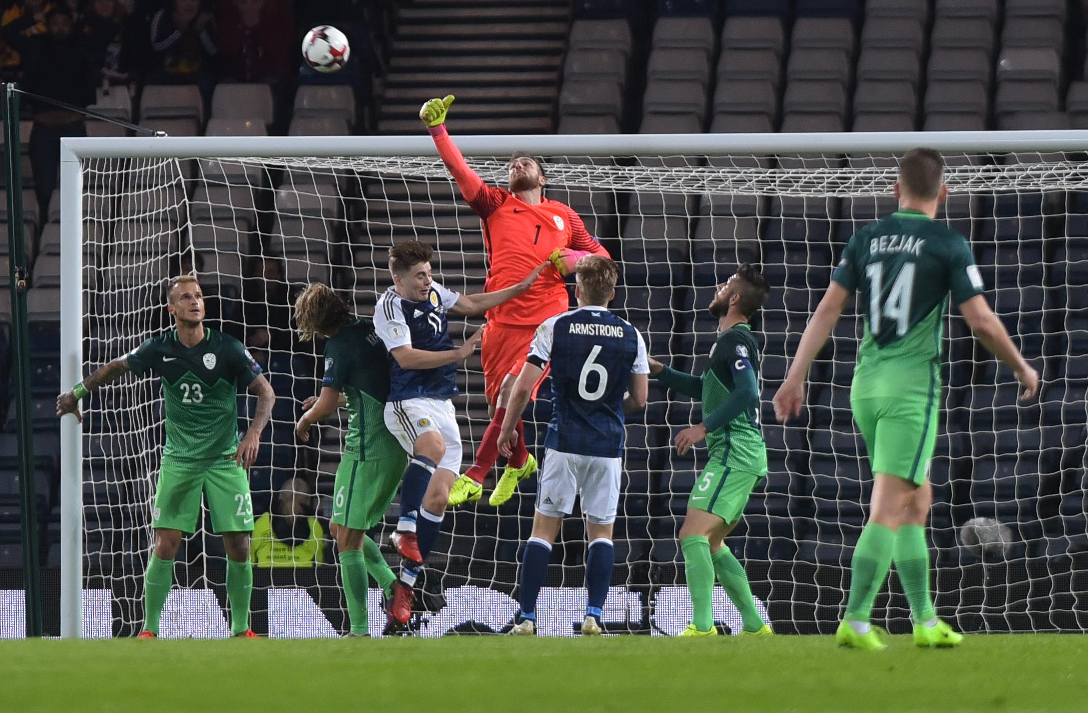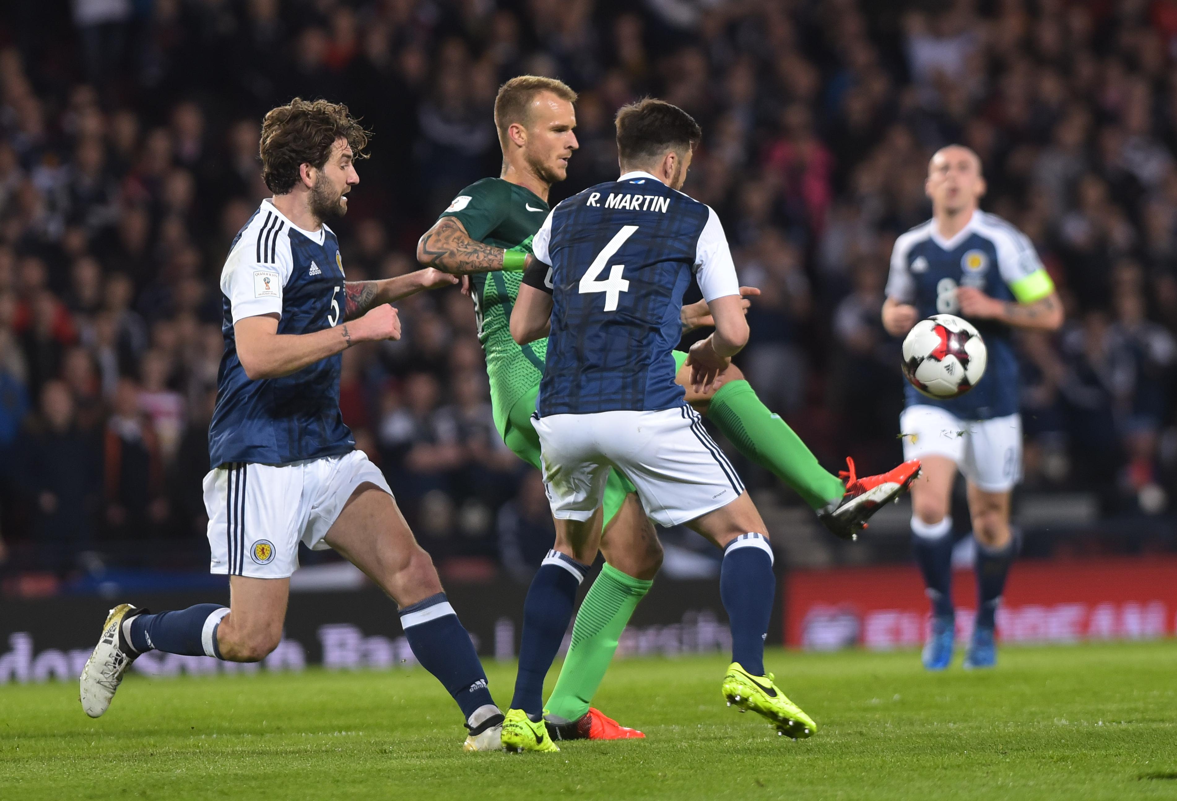 Že v prvi minuti je po kotu streljal Russell Martin, toda izvrstno je posredoval Jan Oblak. V sedmi so Škoti zadeli, a zaradi prekrška v napadu upravičeno ostali brez vodilnega gola. V 17. minuti je Leigh Griffiths zgrešil s strelom z glavo, isti igralec, sicer napadalec Celtica, pa je v 35. in 36. minuti zatresel še prečko (iz bližine) in vratnico (z roba kazenskega prostora). Še eno škotsko priložnost je v 28. zapravil James Morrison, ki je bil malce premalo natančen malce izven kazenskega prostora.